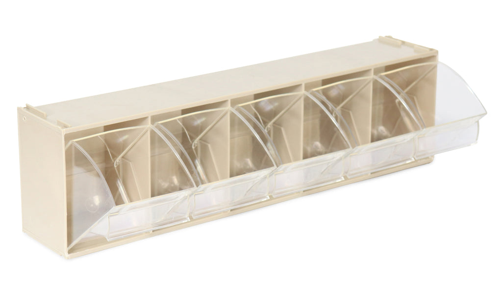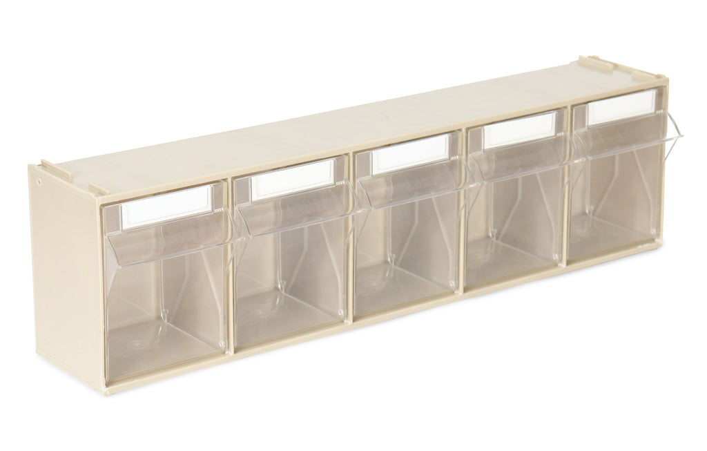 Transparent storage box with 5 tipping chutes, 600x110x164 mm, grey, including holder for perforated panels